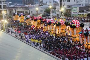 坂出駅前で行われる太鼓台競演では高さ5m・重さ2トンを超える太鼓台10台が